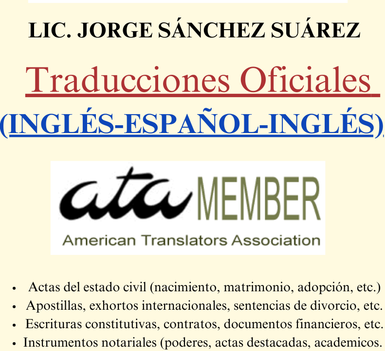 De igual manera las traducciones del español al inglés que surtirán efectos jurídicos en EE.UU./Canadá/Europa, serán aceptadas por sus autoridades migratorias, consulares, judiciales, académicas, etc., ya que se adjunta registro vigente de la Asociación Americana de Traductores de EE.UU., (ATA, por sus siglas en inglés).